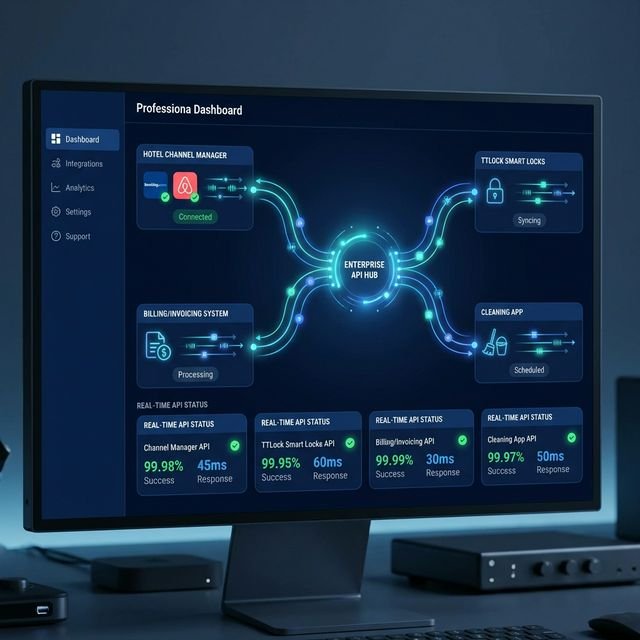 Hub de integración de APIs empresariales: Channel Managers hoteleros, TTLock, facturación y apps de limpieza conectados en un solo ecosistema.